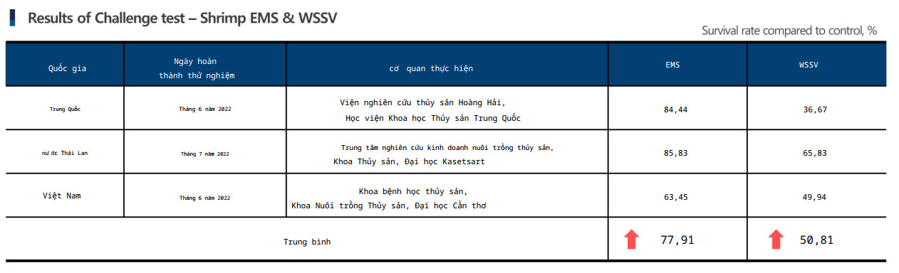 Dưới đây là kết quả cảm nhiễm bệnh WSSV và EMS sau 6-7 tuần cho ăn kháng thể Ig-Guard A đã thực nghiệm tại Trung Quốc, Thái Lan và Việt Nam.