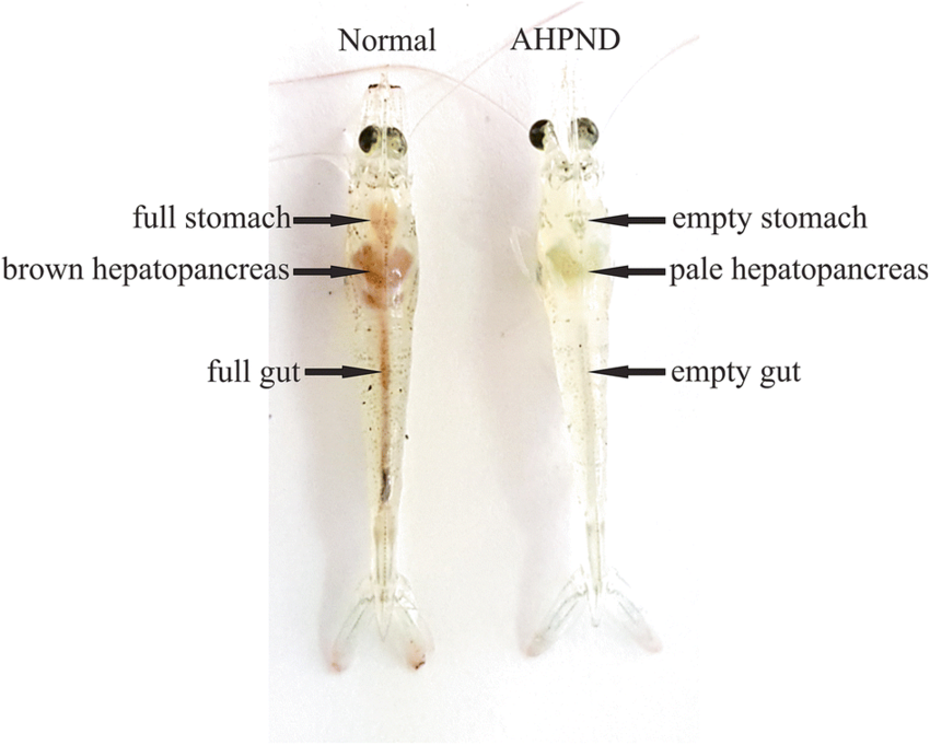 Hình bên trái tôm bình thường, hình bên phải tôm bị AHPND