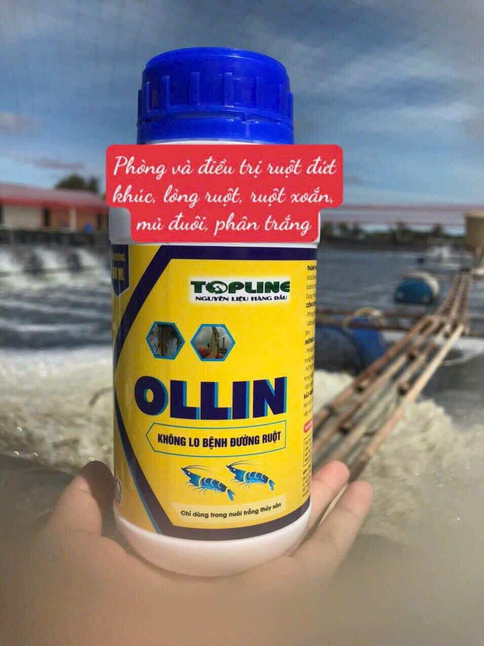 Tôm dưới 45 ngày trộn OLLIN liều 3ml/kg thức ăn, tôm trên 45 ngày trộn liều 4ml/kg thức ăn cho ăn 1 cử sáng, 2 ngày liên tục ngưng 5-7 ngày, các cử còn lại cho ăn men sống Lactozyme liều 10ml/kg thức ăn, sau khi xổ kí sinh ngày thứ 2 diệt khuẩn bằng Brocid 1L/1.000m3.