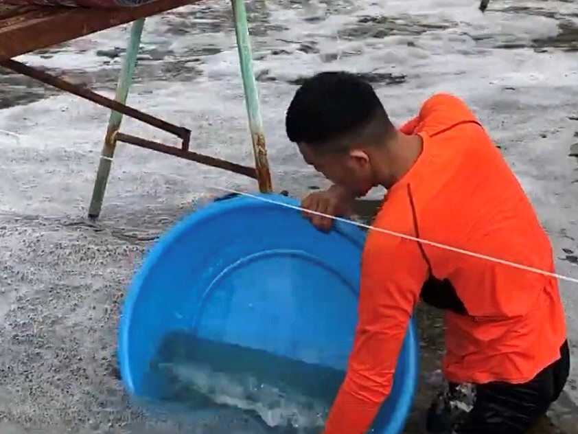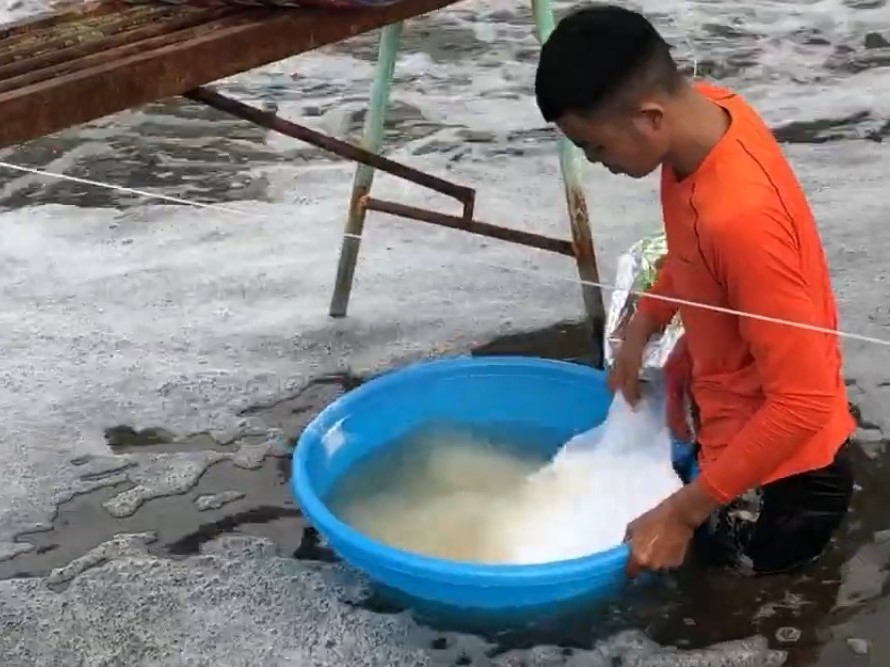 Trộn sản phẩm với nước ao, khuấy đều cho tan hết