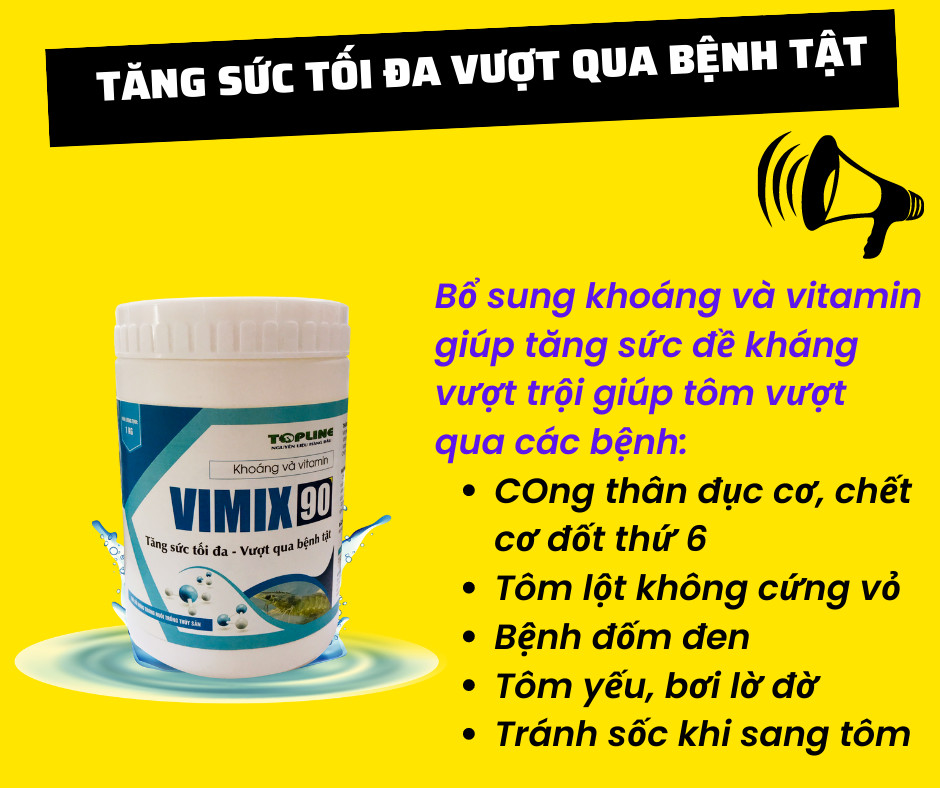 - Khi tôm bị bệnh: trộn 10-15g VIMIX 90 /1kg thức ăn, cho ăn tất cả các cử trong ngày, đến khi tôm hồi phục hoàn toàn